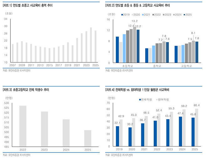 권명준 유안타증권 연구원은 “학령인구 감소로 전체 사교육비 규모는 점진적으로 줄어들 수 있지만 2028년 대학입시제도 개편에 따른 불안감으로 사교육 참여 학생들의 지출은 당분간 이어질 가능성이 크다”고 내다봤다.