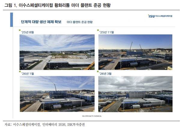 이동욱 IBK투자증권 연구원은 “전고체 배터리 핵심 소재 제조업체인 이수스페셜티케미컬은 세계 황화리튬 수요 확대에 대응하기 위해 선제적인 설비 투자를 집행하고 있다”며 “지난해 9월 착공한 울산 온산 공장 증설은 기존 데모 플랜트를 넘어 본격적인 상업화 플랜트로 전환하는 의미를 가진다”고 밝혔다.