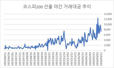 국내 야간 파생상품 시장은 지난해 6월 첫 개장했다. 개설 초기에 1조 원 안팎이었던 코스피200 일평균 거래대금은 빠르게 늘어나는 모습이다.