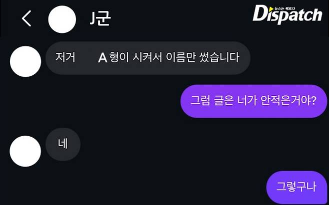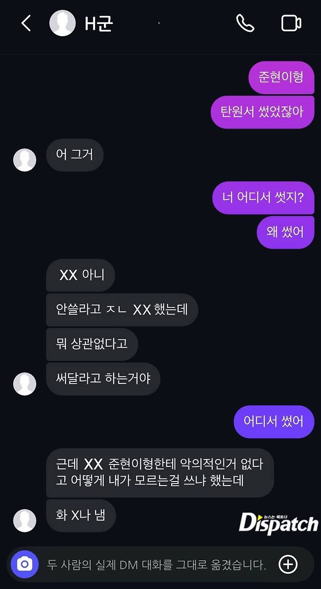 '디스패치'는 H군과 K군이 나눈 DM 대화를 입수했다. 결론부터 말하면, 조작에 가까웠다.