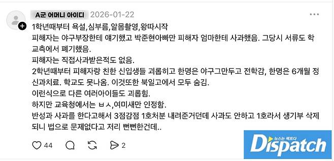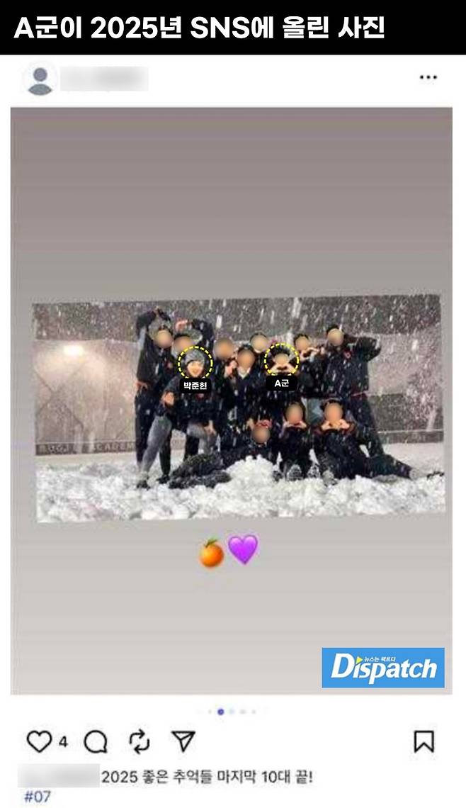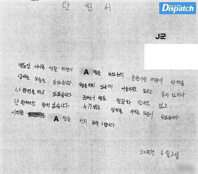 '디스패치'는 A군이 탄원서 내용을 직접 작성했다는 사실 확인서도 입수했다.