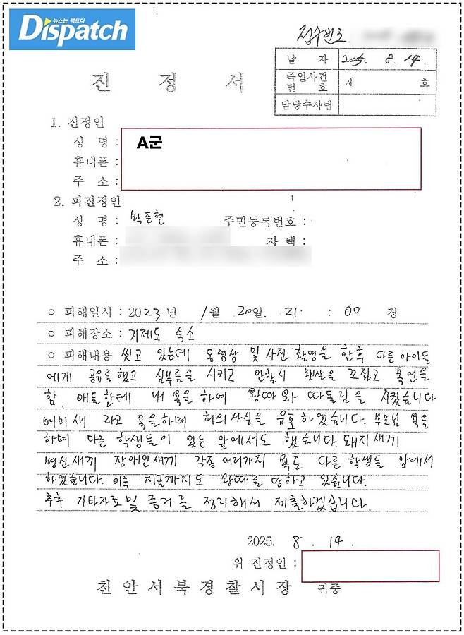 ‘디스패치’가 A군이 경찰서에 제출한 진정서를 확인했다.