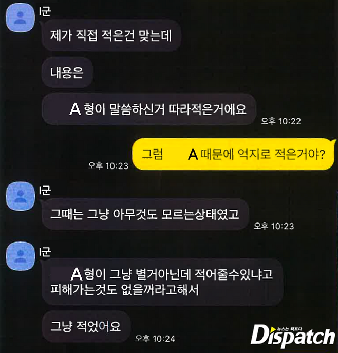 "제가 직접 적은 건 맞는데 내용은 A형이 말씀하신거 따라 적은 거예요. 그때는 아무것도 모르는 상태였고 A형이 그냥 별거 아닌데 적어줄 수 있냐고 피해가는 것도 없을거라고 해서 그냥 적었어요." (I군, 카톡)