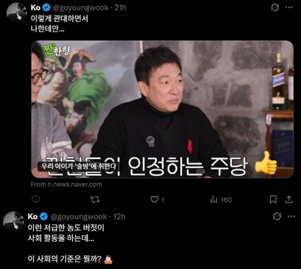 지난 12일 고영욱은 자신의 SNS를 통해 최근 음주운전으로 논란이 된 배우 이재룡이 출연한 유튜브 '짠한형 신동엽' 출연 게시물을 공유하며 "이렇게 관대하면서 나한테만"이라는 글을 게재했다.