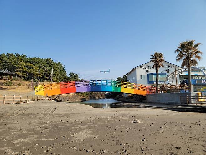 머리 위로는 제주공항으로 향하는 비행기가 낮게 지나간다. 무지개색으로 꾸며진 다리 위로 비행기가 내려오는 장면은 이호테우해변에서 볼 수 있는 독특한 풍경이다. 바다와 등대, 그리고 비행기가 한 장면에 들어오는 이곳은 제주올레 17코스에서 만나는 인상적인 풍경 가운데 하나다.