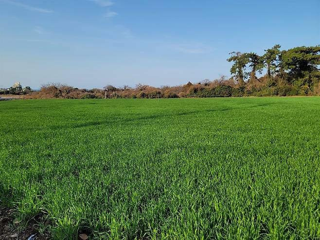 | ▲ 청보리밭 올레길을 따라 펼쳐진 푸른 보리밭 풍경. 제주의 들녘이 초봄의 빛으로 물들고 있다. |