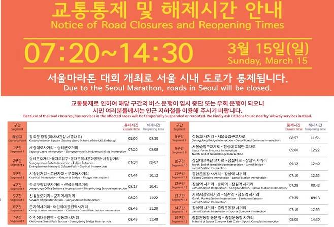 대회 당일 교통 통제는 구간별로 순차적으로 이뤄졌다가 해제된다. 출발지인 광화문광장 일대는 오전 5시부터 오전 8시30분까지 차량 통행이 제한된다. 시청삼거리~고산자교~무교동 사거리는 오전 7시44분부터 오전 10시13분까지, 잠실대교 북단 교차로~잠실대교~잠실역 사거리는 오전 9시12분부터 낮 12시40분까지 통제된다. 도착지인 잠실종합운동장 동문 앞~종합운동장 사거리 구간은 오전 5시부터 오후 2시30분까지 차량 통행이 제한될 예정이다.