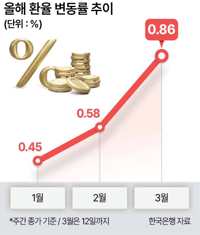 앞으로 중동 사태가 장기화하면서 유가가 계속 출렁이면 이달 환율 변동성은 더 커질 것이라는 전망도 나온다. 이달 12일까지 환율 변동률은 러시아·우크라이나 전쟁이 발발했던 2022년 11월(0.9%) 이후 3년 4개월 만에 최고치다. 당시 총 22일 중 변동률이 1%를 넘긴 것은 9일에 달했다. 무역수지 적자 지속에도 미국 기준금리 인상 속도 조절 가능성이 커지고 당국의 수급 안정화 대책도 맞물린 결과였다. 직전 최고치는 코로나19 사태 초기인 2020년 3월(1.12%)이었다.