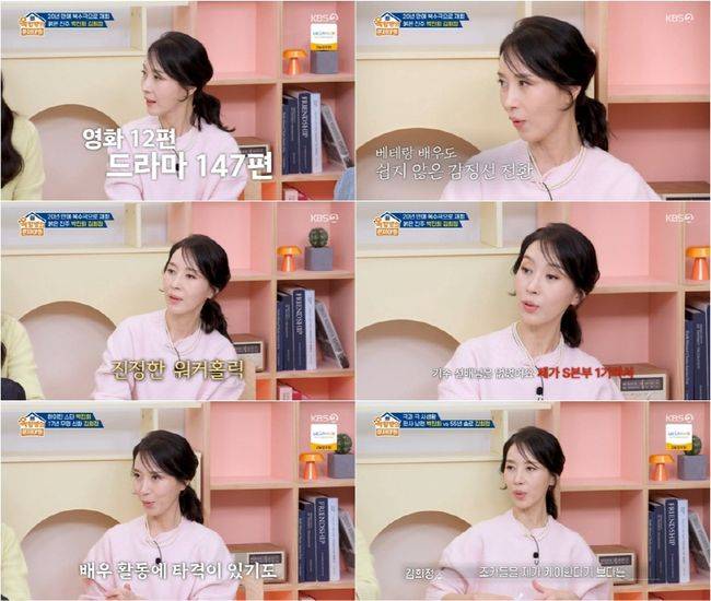 이날 김희정은 영화 12편, 드라마 147편에 달하는 독보적인 출연 기록을 공개했다. "일하고 있을 때 살아 있는 기분"이라고 말하며 촬영에 매진했던 열정을 밝힌 그녀는 동시에 5개 작품을 소화하며 급격한 감정 변화를 겪어야 했던 다작 배우의 고충을 전해 놀라움을 자아냈다.