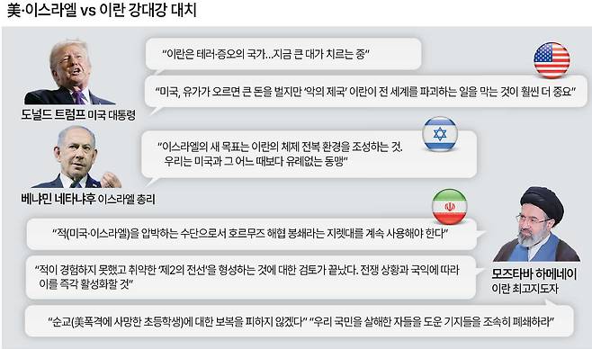 하메네이 정권의 연장선이라 평가됐던 이란의 새 최고지도자가 세계를 향해 내놓은 첫 공식 메시지는 미국·이스라엘을 향한 ‘초강경 대응’이었다. 도널드 트럼프 미국 대통령도 국제유가 급등 우려에 “미국은 석유 생산국이어서 (유가 상승이) 큰 돈을 버는 일”이라며 “이란의 핵 보유 저지가 더 중요하다”고 말했다. 석유를 볼모로 세계 경제를 쥐고 흔들어 미국을 압박한다는 이란의 전략에 미국이 굴하지 않겠다는 반박을 한 셈이다. 진작부터 장기전을 불사하겠다던 이스라엘도 이란 정권 전복이 가능한 환경을 조성하는 것을 새 목표로 삼고 전쟁을 수행하겠다고 밝혔다.