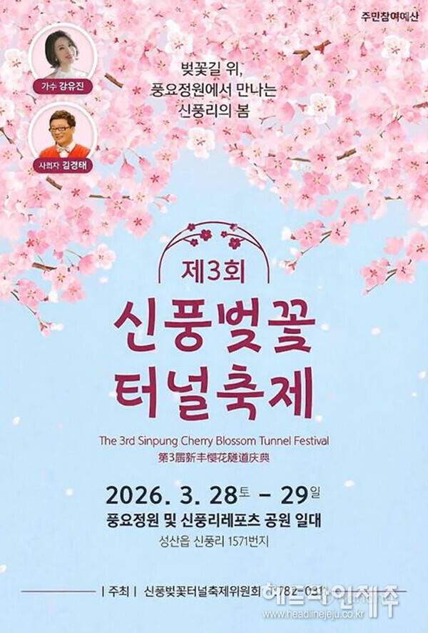 제주 서귀포시 성산읍 신풍리 마을회와 벚꽃축제위원회가 주최하는 '2026 제3회 신풍벚꽃터널축제'가 오는 28일과 29일 이틀간 풍요정원 및 신풍레포츠공원 일원 벚꽃 터널길에서를 열린다.