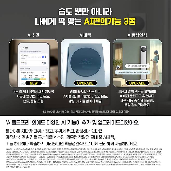이와 함께 다양한 AI 기능도 추가 및 업그레이드 됐다. 수면 중 온도와 습도를 자동으로 조절해 쾌적한 수면 환경을 조성해줄 ‘AI수면’, 레이더센서가 사용자의 위치를 감지해 적합한 바람 온도, 방향, 세기를 알아서 제공하는 ‘AI바람’, 사용자 말의 맥락을 파악해 에어컨 운전모드 추천부터 제품 작동 중 상태 브리핑, 생활 검색이 가능한 ‘AI음성인식’ 기능 등을 통해 사용자 편의성을 높였다.