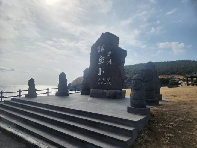 | ▲ 송악산의 시작을 알리는 웅장한 표지석과 제주의 상징 돌하르방이 탐방객을 맞이한다. |