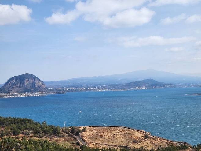 | ▲ 코앞에는 거대한 조각품 같은 산방산이 웅장하게 버티고 섰고, 그 너머로 영험한 한라산 능선이 길게 이어진다. |