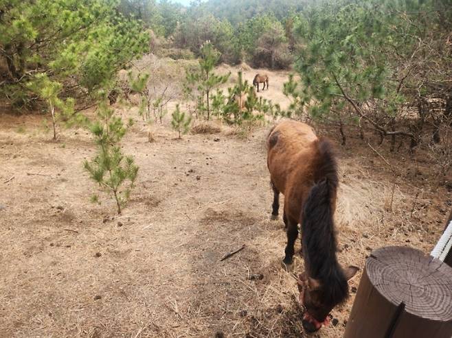| ▲ 세상의 속도와 상관없이 묵묵히 제 자리를 지키며 풀을 뜯는 조랑말이 송악산의 고요를 완성한다. |
