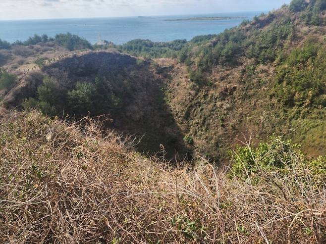 | ▲ 깊게 패인 송악산 분화구 전경. 육안으로는 다 담기지 않는 거대한 분화구에서 태고의 숨결이 느껴지는 아찔한 깊이감이 전해진다. |