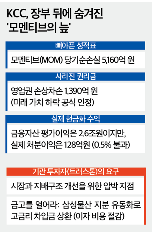 [뉴스토마토 이재영 기자] KCC가 야심 차게 인수한 미국 모멘티브 사태가 '승자의 저주'로 치닫고 있습니다. 거액의 순손실과 영업권 손상이 발생했음에도, KCC는 자산가치 평가법 변경과 미실현 투자 수익을 동원해 장부상 실적을 부풀리는 '회계적 기교'를 선보였습니다. 하지만 이러한 '착시현상'은 트러스톤자산운용 등 기관투자가들의 비판과 지배구조 개선 요구에 직면했습니다.