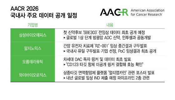 13일 업계에 따르면 삼성바이오에피스를 비롯해 알지노믹스, 오름테라퓨틱, 와이바이오로직스는 내달 17일(현지시간) 미국 샌디에이고에서 개막하는 AACR을 통해 각각 개발 중인 항암 파이프라인 초기 데이터를 통해 발표할 예정이다.