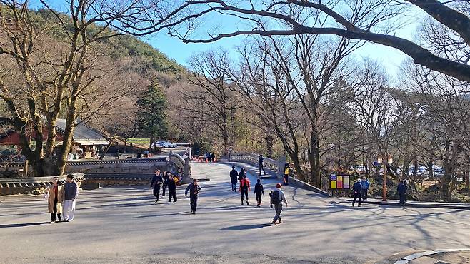 아직까지 완연한 봄은 아닌지라 쌀쌀한 날씨에도 많은 여행자들의 발길이 화엄사로 이어진다. 산자락에는 아직도 잔설이 남아 있고, 일주문 앞을 흐르는 계곡 가장자리는 하얀 얼음도 녹지 않은 채 덩어리로 남아 있다.