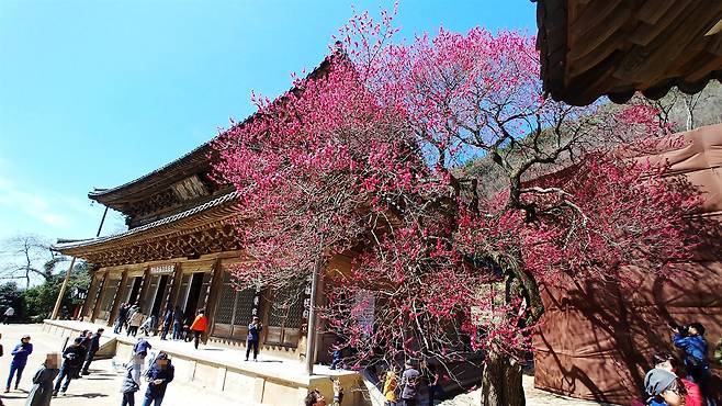 화엄사 각황전 앞에 터 잡은 홍매화, 3월 20일 이후 절정에 이를 듯