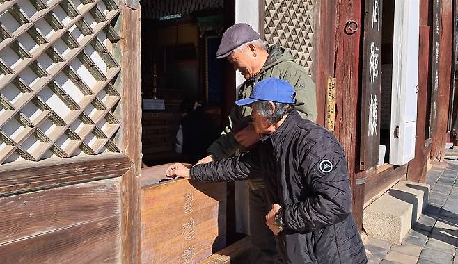 | ▲ 보시 대웅전 불전함에 보시하는 여행자. |