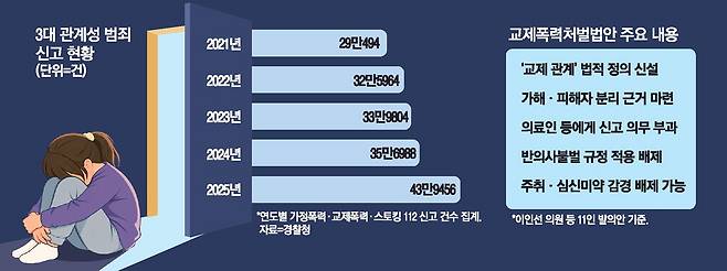 부부나 연인, 교제하던 사이 등 친밀한 관계에서 발생하는 관계성 범죄 신고가 지난해 44만건 가까이 발생하며 역대 최다를 기록했다. 관계성 범죄에 대한 사회적 인식이 바뀌고 피해자의 신고 의지가 높아진 결과로 풀이되지만, 여전히 수면 아래 감춰진 피해가 상당할 것이라는 지적도 나온다.