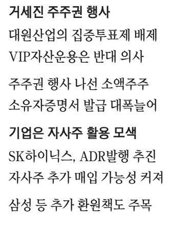 글로벌 펀드에 이어 국내 운용사와 개인투자자들이 정기주주총회를 앞두고 주주권 행사 수위를 끌어올리고 있다. 주주권 행사를 위한 소액주주들의 소유자증명서 발급도 급증하는 상황에서 최근 상법 개정에 따른 자사주 처분이 주총의 주요 이슈로 부각되고 있다. 13일 VIP자산운용은 코스닥 상장사 대원산업 이사회가 상정한 재무제표 승인 의안에 대해 반대 의견을 표명했다. VIP자산운용은 그간 우호적 행동주의 펀드를 표방했지만 대원산업이 순현금 4100억원 보유에도 시가총액이 2700억원에 불과한 저평가 상황에서 집중투표제를 배제하려 하자 주총 안건에 공개적으로 반대 의사를 밝혔다. 대주주 지분이 50%가 넘는 상황에서 집중투표제가 배제되면 소수주주들이 이사를 선임할 수 있는 수단이 없어 현재 주가순자산비율(PBR) 0.48배의 저평가가 심해질 수밖에 없다는 이유에서다.