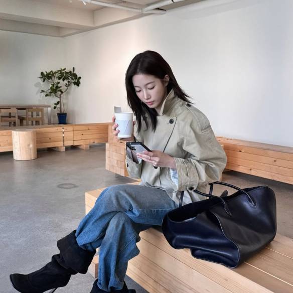 숏 트렌치의 쿨한 변신, 카즈하가 선택한 트렌치와 배기 진 조합