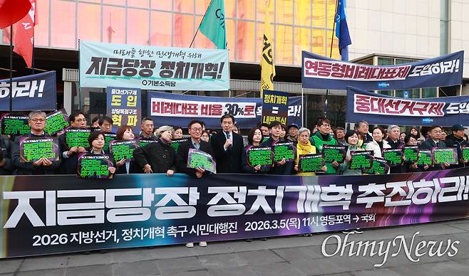 20여 명 개혁진보4당(조국혁신당·진보당·기본소득당·사회민주당 등) 의원들이 "3월은 정치개혁의 마지막 골든타임", "제도가 바뀔 때까지 하겠다"며 국회 앞 릴레이 천막 농성에 돌입했다. 이들은 지방의회의 일당 독식, 무투표 당선 등의 폐해를 없애려면 양당에 유리한 현행 2인 선거구제가 아니라 3~5인을 뽑는 '중대선거구제'를 도입해야 한다고 강조한다. 또한 지자체장 결선투표제를 도입하고 광역·기초 비례 의석을 현행 10%에서 30%까지 확대할 것 등도 요구한다.