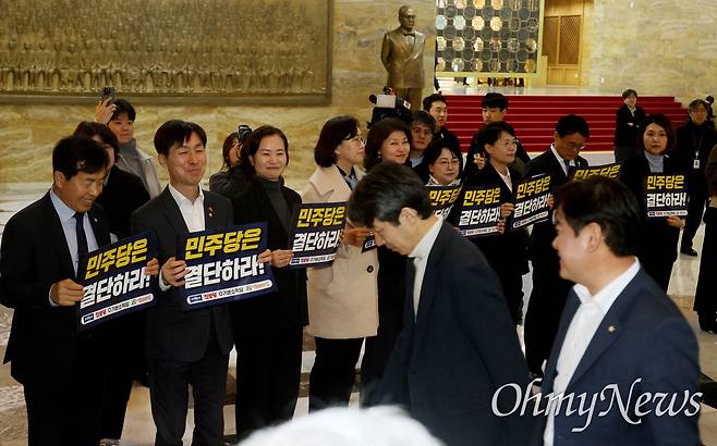 | ▲ 조국혁신당, 진보당, 기본소득당, 사회민주당 의원들이 12일 오후 서울 여의도 국회 로텐더홀에서 본회의에 참석하는 더불어민주당 의원들을 향해 정치개혁 입법을 촉구하고 있다. |