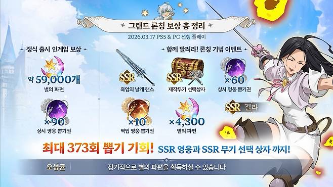정식 출시를 기념해, 접속만 해도 SSR 영웅 '길라'와 SSR 무기를 제공하며, 각종 이벤트와 게임 플레이를 통해 최대 373회 수준의 소환 기회를 얻을 수 있다.