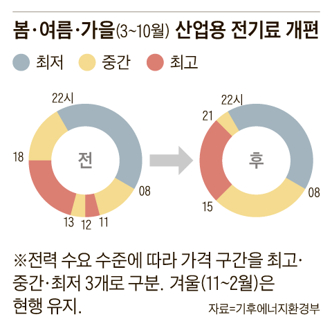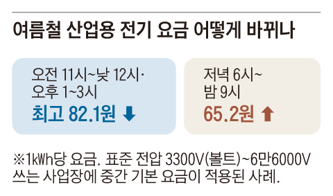 이에 따라 전력 단가가 가장 비싼 여름철을 기준으로, 오전 11시~낮 12시와 오후 1~3시에 전기를 쓰는 기업은 개편 전보다 계약별로 kWh(킬로와트시)당 70.3~82.1원의 인하 효과를 본다. 반면 여름철 오후 6~9시는 전기 요금이 kWh당 53.4~65.2원 인상되는 구조다. 기업들의 낮 시간대 전기 소비를 끌어올리기 위한 인센티브인 셈이다.