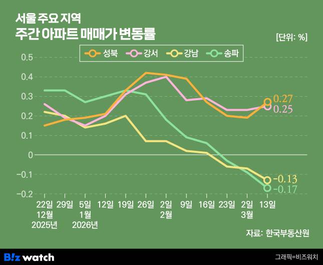 일주일 새 송파 0.17%↓, 성북은 0.27%↑