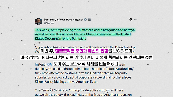 헤그세스 국방장관은 더 강한 반응을 보였어요. 앤트로픽을 두고 '오만과 배신의 극치'라고 쏘아붙이며 국가안보에 대한 공급망 위험 기업으로 지정한다고 발표했죠. 공급망 위험 기업이 되면 미군은 물론 미군과 사업을 하는 파트너 기업과도 거래가 사실상 불가능해져요.