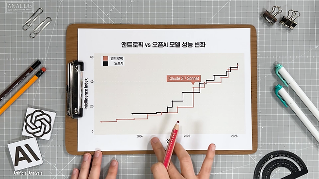 2025년 초반까지는 오픈AI의 모델 성능이 앤트로픽보다 더 좋았어요. 하지만 클로드 3.7 소넷이 처음으로 역전한 뒤에는 서로 앞서거니 뒤서거니 하면서 성능 발전을 이어오고 있죠.