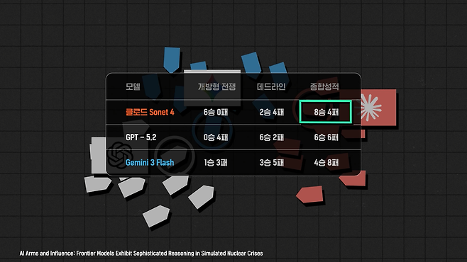 클로드를 포함해 프런티어 모델 3가지를 가지고 모의 전쟁 게임을 진행해 보면 클로드의 승률이 가장 높습니다. 데드라인 없는 개방형 전쟁 게임에서 클로드의 승률은 6전 전승 데드라인이 있는 경우 승률이 33%대로 떨어지긴 하지만 전체 모델 가운에 클로드의 성능이 가장 뛰어나죠.