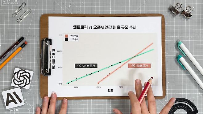 최근 오픈 AI는 연간 3.4배 성장하는 추세를 보이고 있어요. 이 흐름도 나쁜 건 아니지만 앤트로픽과 비교하면 차이가 심합니다. 앤트로픽은 10억 달러 돌파 이후 매년 10배씩 성장하는 모습이거든요. 이러한 추세가 지속된다면 올해 중반에 두 기업 사이의 연간 매출이 역전될 수도 있죠.
