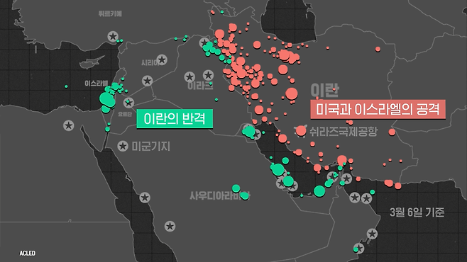이란의 공항과 공군기지뿐 아니라 각지에 있는 군사 목표물을 향해 미국과 이스라엘은 미사일을 퍼부었습니다. 이란도 곧바로 반격에 나서면서 이스라엘과 주변 중동 국가에 있는 미군 기지를 향해 미사일을 발사했습니다. 공습 과정에서 이란 남부 지역의 초등학교에서 100명이 넘는 어린이 사망자가 발생하는 안타까운 일도 발생했습니다.