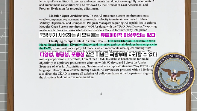 "국방부가 사용하는 AI 모델에는 유토피아적 이상주의는 없다" "다양성, 형평성, 포용성 같은 이념은 국방부에 자리할 수 없다"