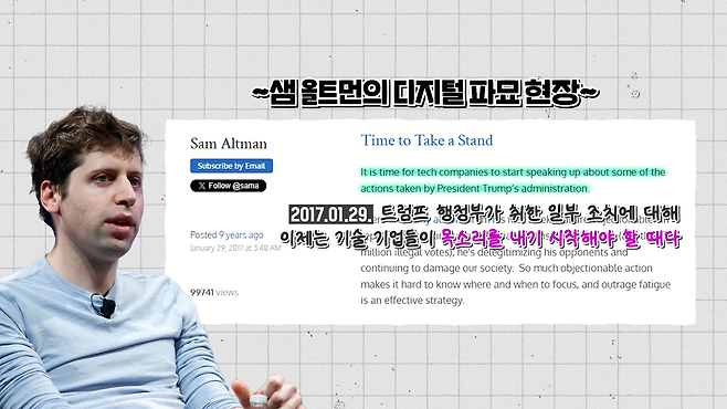 하지만 트럼프 2기 행정부가 출범한 이후 태도가 돌변했어요. 트럼프 취임식에 100만 달러의 기부금도 회삿돈이 아닌 개인 자금으로 보냈고, 트럼프 취임식에도 참여했죠. 오픈AI 경영진들도 트럼프를 지지하는 슈퍼팩에 수천만 달러를 기부할 정도로 입장이 180도 바뀐 겁니다.
