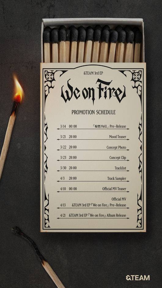 미니 3집 'We on Fire'는 더욱 강해진 유대와 새로운 도전을 향한 &TEAM의 의지를 담은 작품이다. 오는 22일과 23일 이 앨범의 콘셉트 포토와 콘셉트 클립이 공개되고, 30일에는 트랙리스트가 베일을 벗는다. 이어 4월 3일 트랙 샘플러를 통해 수록곡 일부를 미리 들어볼 수 있다. 4월 13일에는 타이틀곡 뮤직비디오와 전곡 음원이 먼저 발매되고, 음반은 같은 달 21일 나온다.