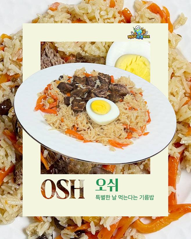 한국에 ‘볶음밥’ , 인도네시아에 ‘나시고렝’이 있다면 우즈베키스탄에는 ‘오쉬’가 있다. 첫 인상은 잘 포장된 종합선물세트처럼 느껴진다. 밥, 고기와 채소, 달걀까지 곁들인걸 보면 한 접시로도 다양한 맛과 충분한 영양을 챙기려고 한 노력이 엿보인다. 사장님은 오쉬의 가장 큰 특징이 지역마다 재료, 조리법부터 맛과 색감까지 다양하다는 점을 꼽았다.