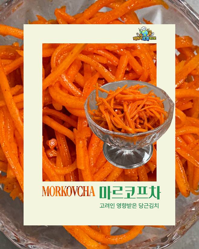 얇게 자른 당근 보이는 이 반찬은 ‘마르코프차’다. 피자에 피클이 있고, 치킨에 무가 있다면 우즈베키스탄 식탁엔 이 마르코프차가 있다. 고려인들이 배추를 구하기 어려운 환경에서 당근으로 절임을 만들며 자리 잡았다고 알려진 음식이다. 차갑고 새콤한 맛이 기름기를 정리해준다. 라그만 한 젓가락 뒤에 마르코프차를 한 번 집으면 더 이상 반찬이 따로 필요 없다는 말이 이해된다. 오쉬와 곁들여도 그 조합이 일품이다.