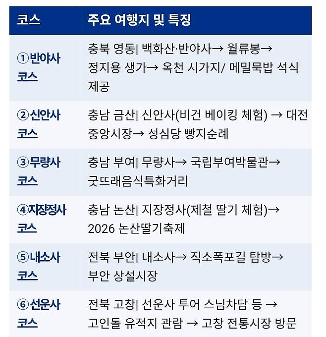 이번 여행은 ▲영동 반야사 ▲금산 신안사 ▲논산 지장정사 ▲부여 무량사 ▲부안 내소사 ▲고창 선운사 등 개성 넘치는 6개 사찰과 연계한 총 6개 코스로 운영한다. 각 코스는 사찰 체험에 그치지 않고, 지역을 대표하는 체험형 요소, 자연경관, 문화유산, 전통시장, 지역 축제 등을 연계해 풍성한 하루 여정을 완성했다.