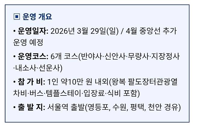 코레일관광개발이 한국불교문화사업단과 공동 기획한 ‘2026 봄맞이 사찰 체험(템플스테이) 기차 여행’이 오는 29일(일) 호남선으로 첫 출발한다.