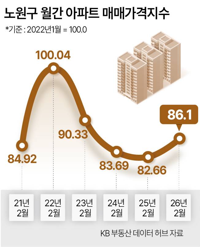 KB 월간 아파트 매매가격지수에 따르면 노원구 지수는 지난달 기준 86.10(기준월=2022.1, 100)으로 1년 전 82.66에 비해 3.44포인트 상승했다. 코로나19 팬데믹 시기 저금리, 유동성 확대 등으로 2021년 2월 84.92에서 2022년 100.04까지 올랐던 것과 비교하면 상승폭이 제한적이다.