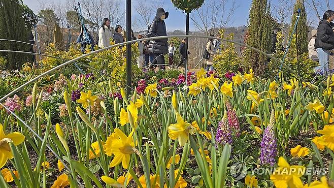 (임실=연합뉴스) 완연한 봄 날씨를 보인 14일 전북 임실군 옥정호 붕어섬에서 관광객들이 수선화와 튤립 등이 피어있는 꽃길을 걸으며 추억을 쌓고 있다. 2026.3.14 [임실군 제공. 재판매 및 DB 금지]