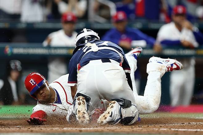 3회말 게레로 주니어의 우중간 2루타 때 1루에 있던 주자 후안 소토가 홈 베이스를 노렸다. 이번엔 한국 수비진의 홈 송구가 정확히 도착했다. 그러나 소토는 몸을 비틀어 포수 박동원의 태그를 절묘하게 피했고, 완벽한 아웃 타이밍을 추가 득점으로 바꿨다.