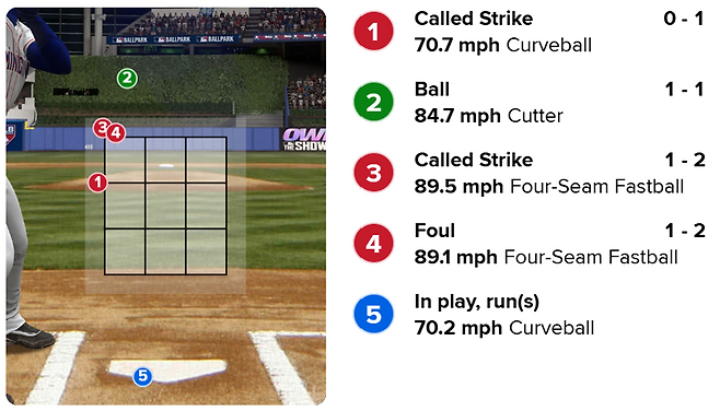 메이저리그(MLB) 공식 홈페이지 MLB닷컴에 따르면, 류현진의 5구째 커브볼은 2023, 2026 WBC를 통틀어 장타를 허용한 공 중에서 가장 낮은 위치로 들어왔다. 동시에 타자 카미네로가 빅리그에서 안타를 쳐낸 투구 중 낮은 공이기도 했다. 이런 코스의 변화구마저 장타로 만들면 '공을 어디로 던져야 하나'라는 의문이 들 수밖에 없다.
