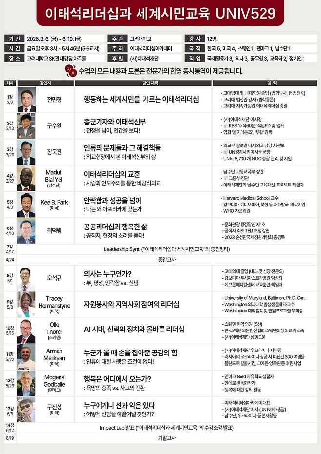 | ▲ 13일 서울 성북구 고려대학교 대강당 아주홀에서는 구수환 (사)이태석재단 이사장의 '종군기자와 이태석신부: 전쟁을 넘어, 인간을 보다!' 강연이 열렸다. ‘이태석 리더십과 세계시민교육’ 과목의 연사진 리스트. |